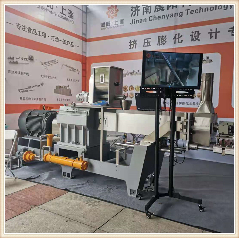 濟(jì)南晨陽公司攜帶新款CY65雙螺桿膨化主機(jī)亮相第19屆漯河食品博覽會,一經(jīng)亮相,變引起了眾多膨化食品生產(chǎn)企業(yè)的關(guān)注咨詢。詳細(xì)詢問該新款機(jī)型的性能特點(diǎn),和核心產(chǎn)品加工。該款65主機(jī)搭載45kw-6級電機(jī)直連傳動,齒輪箱使用原裝南京擠出機(jī)箱體,螺桿使用分段積木組合結(jié)構(gòu),機(jī)桶使用內(nèi)壁噴涂耐磨襯套材料。機(jī)桶恒溫控制,PLC自動控制,切割模頭升級。