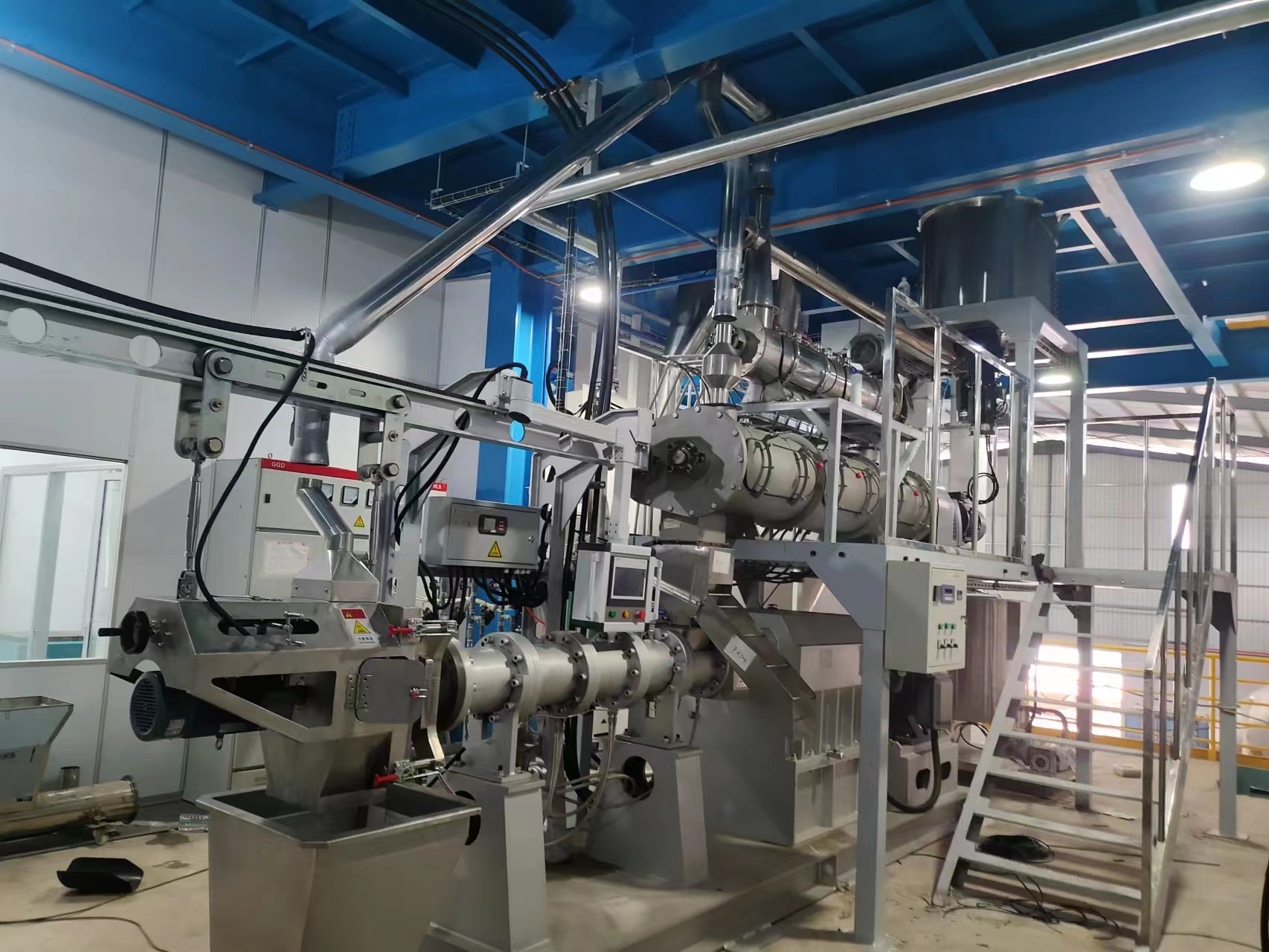 膨化:混合后的物料進入雙螺桿擠壓膨化機,在高溫高壓的條件下,原材料中的淀粉被膨化并轉(zhuǎn)化為可消化的形式,通過調(diào)節(jié)模具可以控制顆粒的大小和形狀