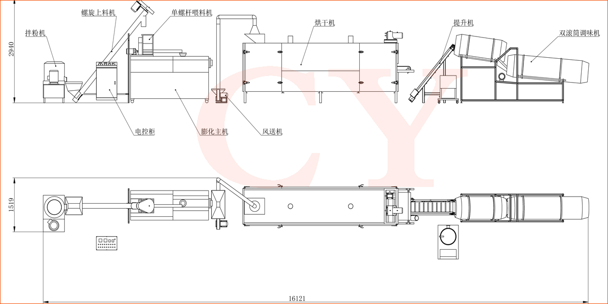 拌粉機→螺旋上料機→雙螺桿膨化機→風(fēng)送機→三層烤箱→中提升機→-雙滾筒調(diào)味機→電子包裝機