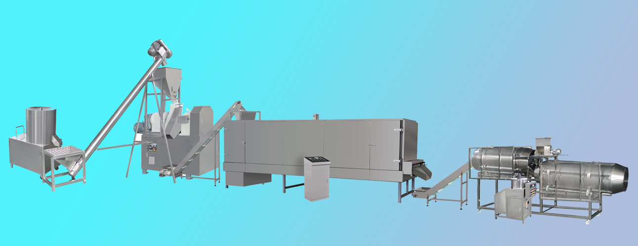 拌粉機→膨化機→提升機-一滾篩-提升機-連續(xù)油炸機-振動脫油機--單滾筒調味機-調味機