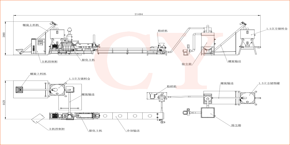 拌粉機→螺旋提料機→膨化主機→風送機→烘干機→除塵粉碎機→批次式混合機→包裝機