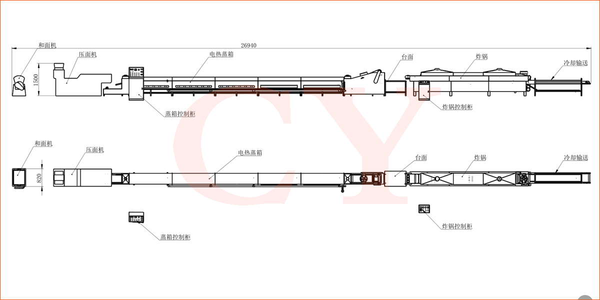 和面機→壓面機→蒸煮切斷機→油炸機→冷卻機